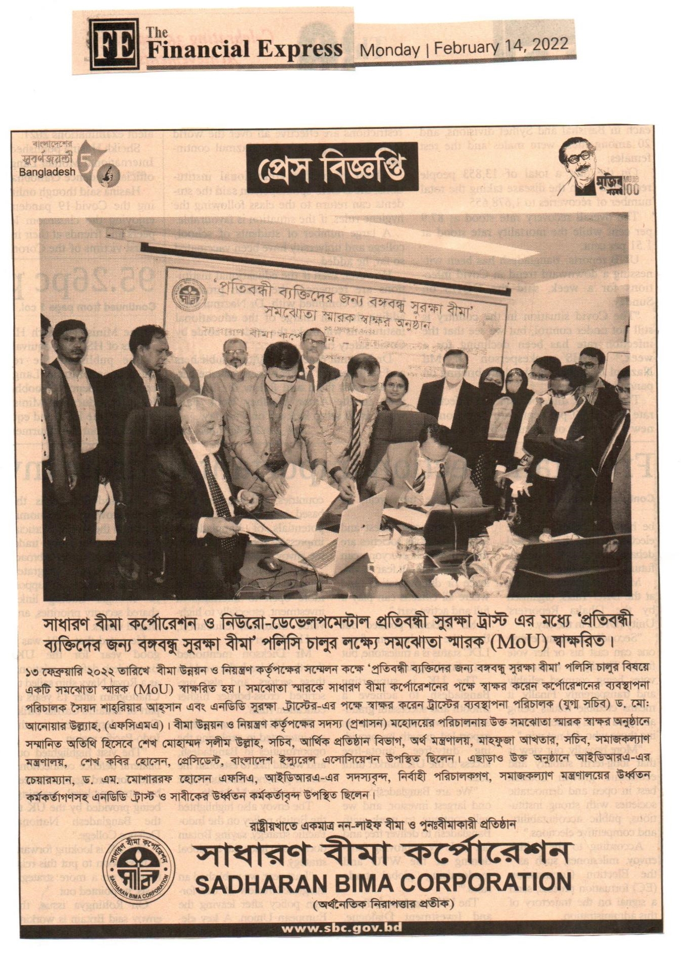 নিউরো-ডেভেলপন্টোল সমঝোতা স্মারক স্বাক্ষর অনুষ্ঠানের দৈনিক পত্রিকায় প্রকাশিত ছবি